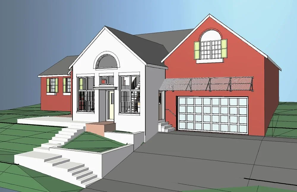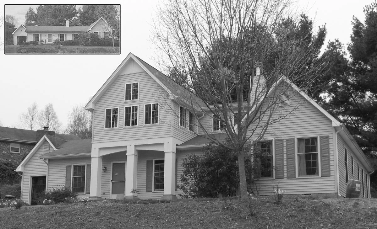 Marc believes that almost all stock house plans need to be customized, if for no other reason than that the site dictates it. Pictured here is an addition design project which illustrates the point. Note the before photo of the home, which undoubtedly started as a stock plan. The home, as a ranch with some 1/2 story bonus room space, was clearly designed with a flat lot in mind. However, due to the steep front yard and cross slope, the garage has been placed uncomfortably low with respect to the bonus room above. The client intuitively knew that the facade was highly unbalanced. Something needed to be done with that huge expanse of brick between the garage door and the upper window. The proposed scheme addressed this problem with a polycarbonate and steel awning in connection with a bold new Entry and Great Room used to more properly balance the facade.